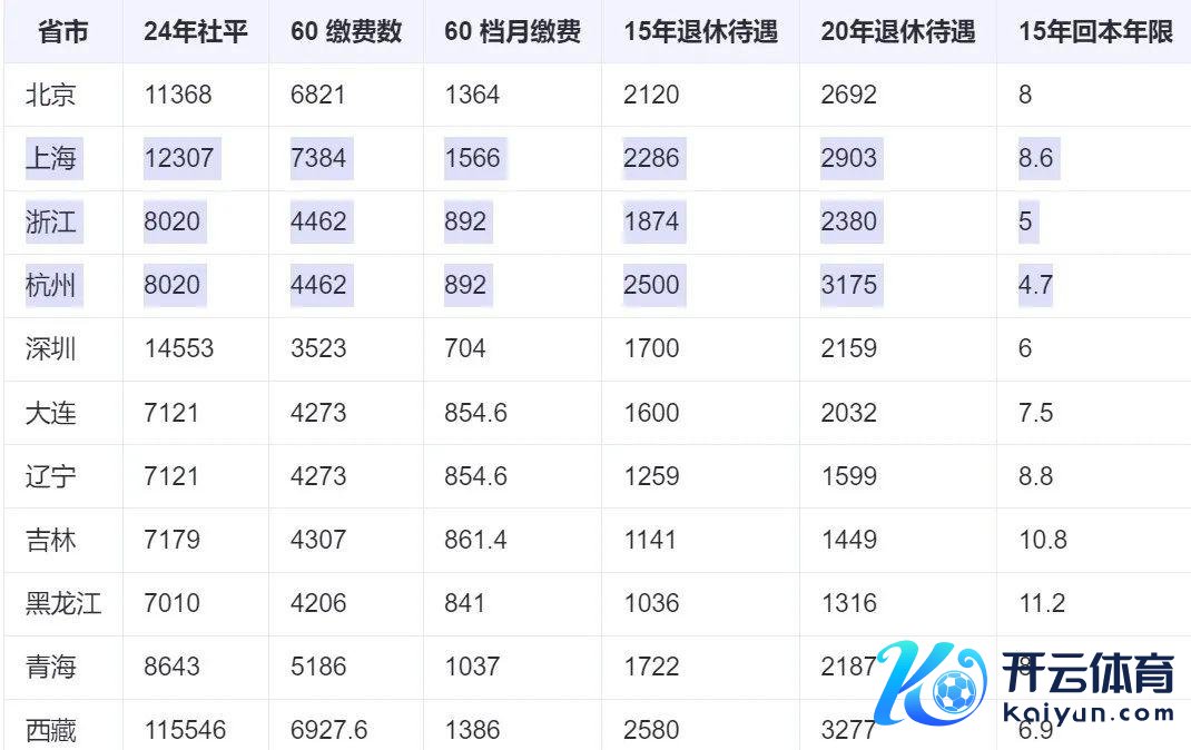 我们来看一下,2024年各省市按照最低60档缴费15年的退休金数额。