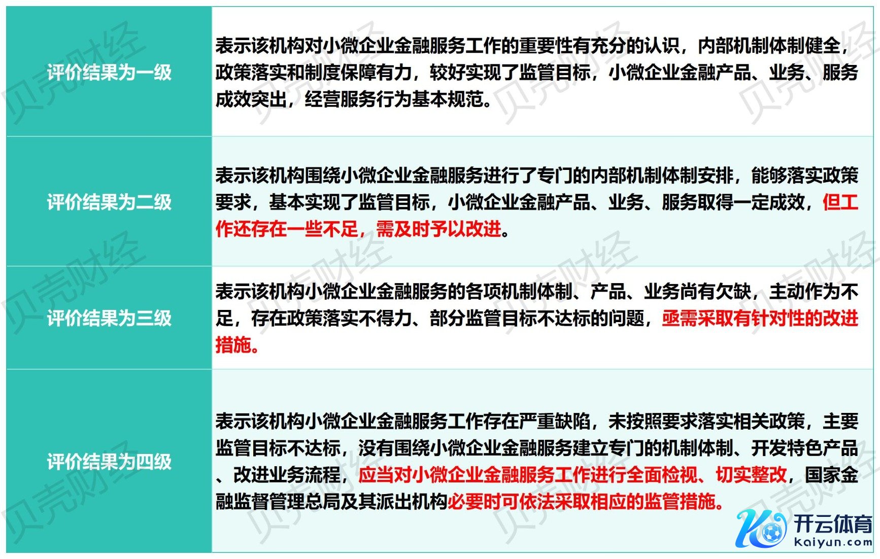 记者醒目到,银行业金融机构小微金融监管评价成果,按其品级对应,代表了不同的含义。