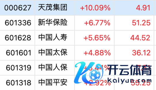 保障股大涨,天茂集团涨停,新华保障大涨近7%,中国东说念主寿涨超5%,中国太保涨超4%。