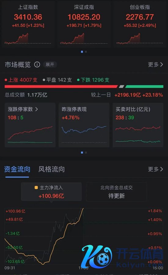 12月6日上昼,三大指数大幅走强,沪指重回3400点,创业板指盘中一度大涨3%,放胆午间收盘,上证指数涨1.23%,深成指涨1.79%,创业板指涨2.49%。