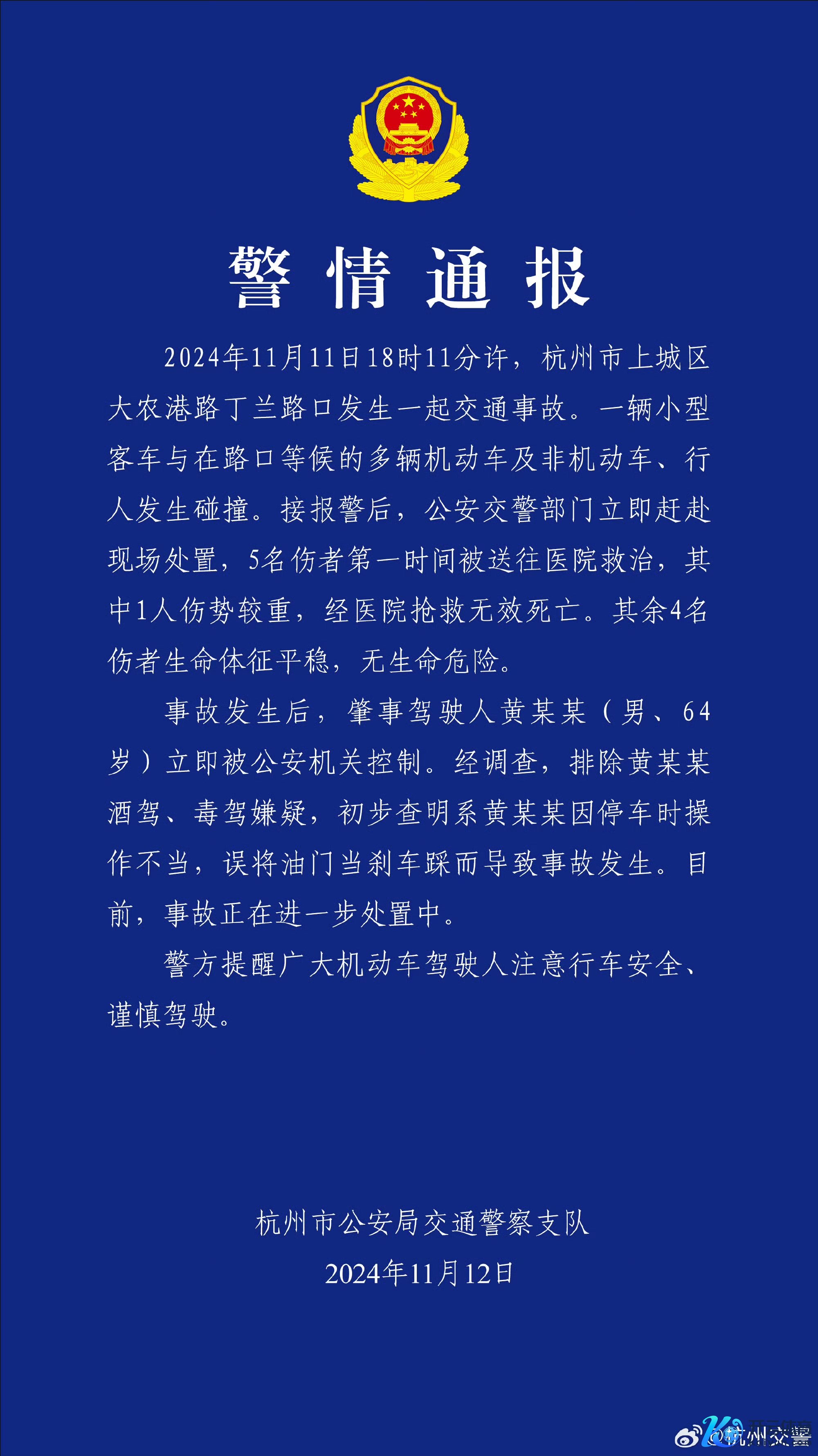 杭州一微型客车连撞多东说念主致1死4伤 警方通报:肇事者已被收尾杭州一微型客车连撞多东说念主致1死4伤 警方通报:肇事者已被收尾