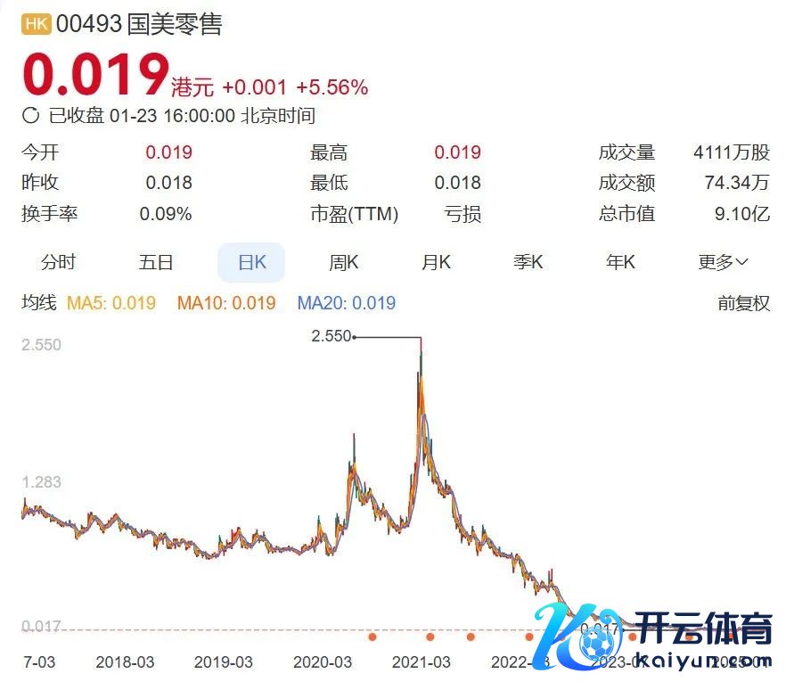 重返国好意思之时,国好意思零卖的股价更是创下十年新高。尽管仅仅2.55港元,但相较之而后四年间终年徜徉于1港元之下,以致如今跌至0.019港元的股价而言,当日二级商场的积极反馈已是近十年的“高光期间”。