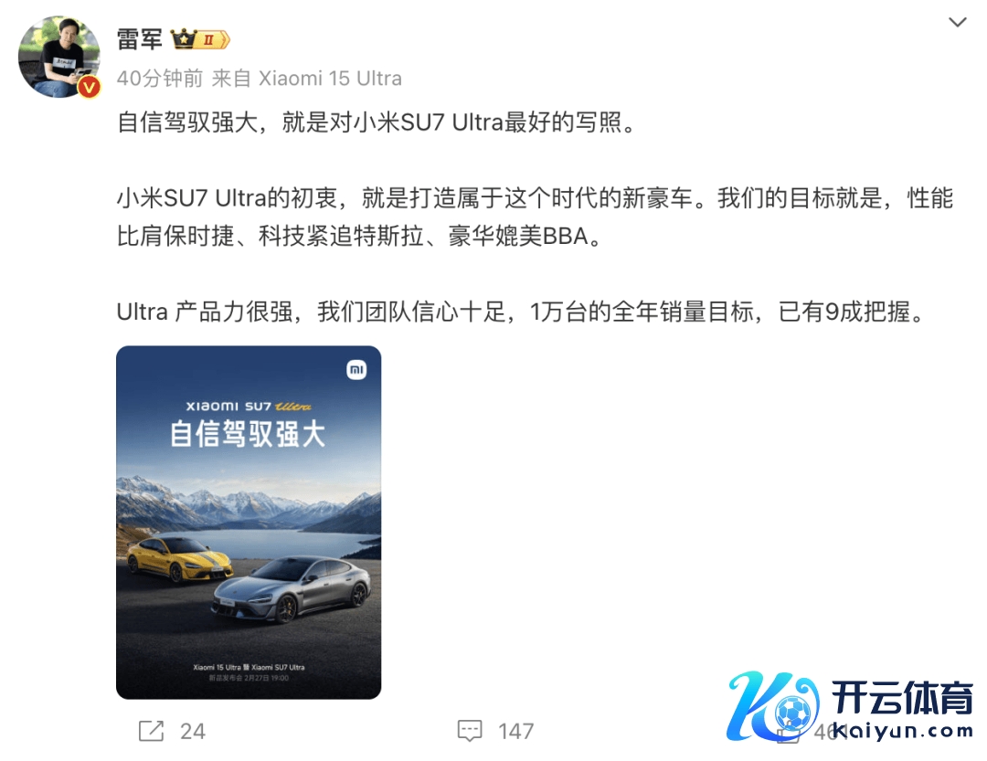 2月26日早间,小米独创东说念主,董事长兼CEO雷军在微博发文称,关于小米SU7 Ultra,团队信心透彻。“居品力很强,咱们团队信心透彻,1万台的全年销量主义,已有九成把合手。”