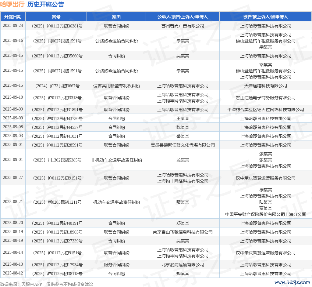 案号:(2025)沪0112民初38118号审理法院:上海市闵行区东谈主民法院案由:契约纠纷当事东谈主信息: 原告/上诉东谈主:郑某某 被告/被上诉东谈主:上海哈啰普惠科技有限公司开庭日历:2025年8月12日说明统计,近一年内以上海哈啰普惠科技有限公司为当事东谈主的历史开庭公告有293则,其中案由为“灵活车交通事故职守纠纷”的公告以81则居首,其次为“契约纠纷”有54则,“联营契约纠纷”有25则。历史开庭公告(前20条)如下:
